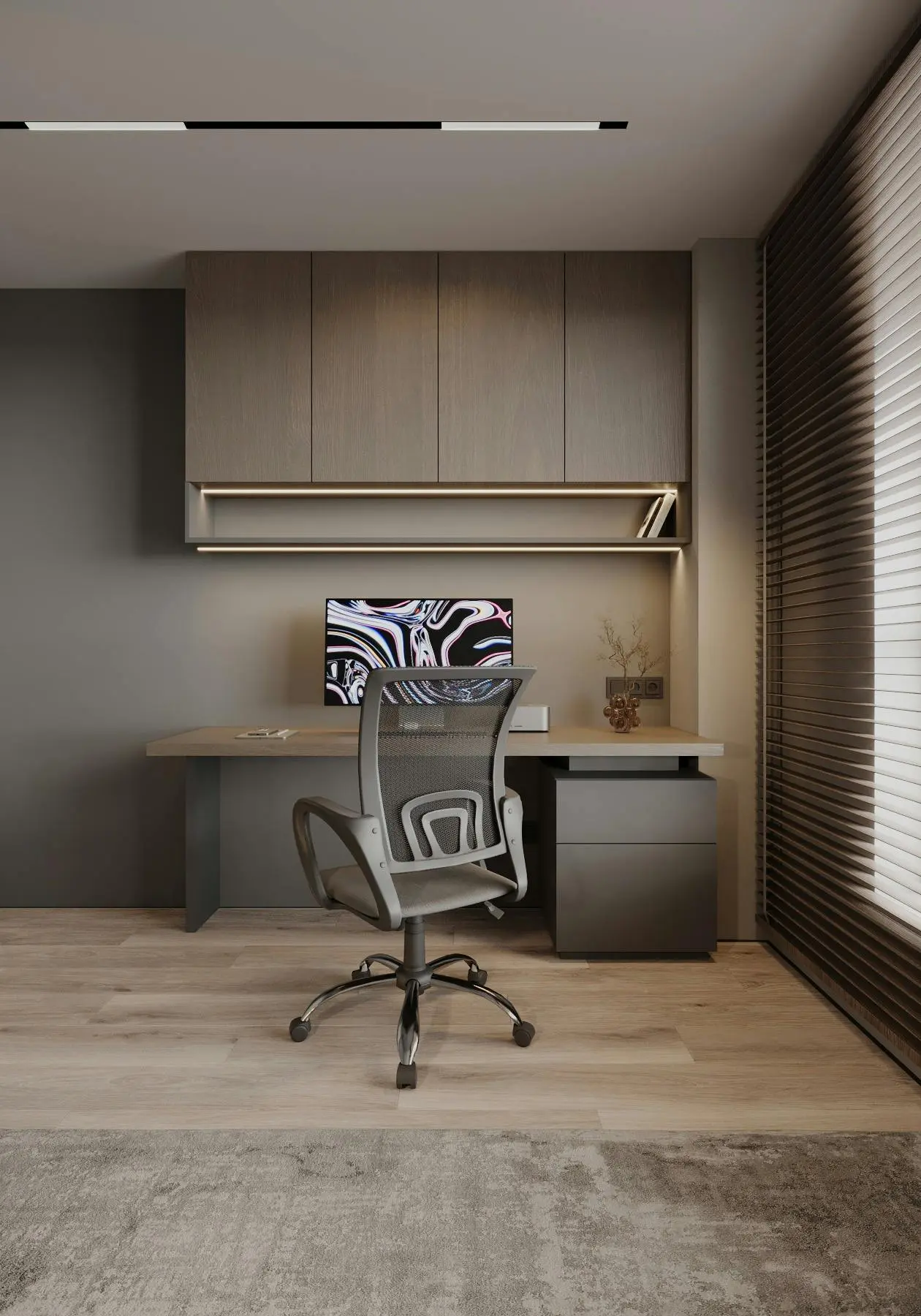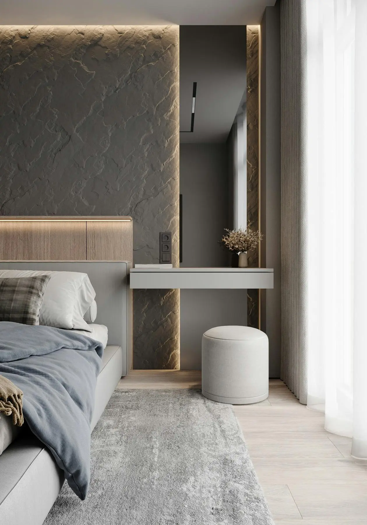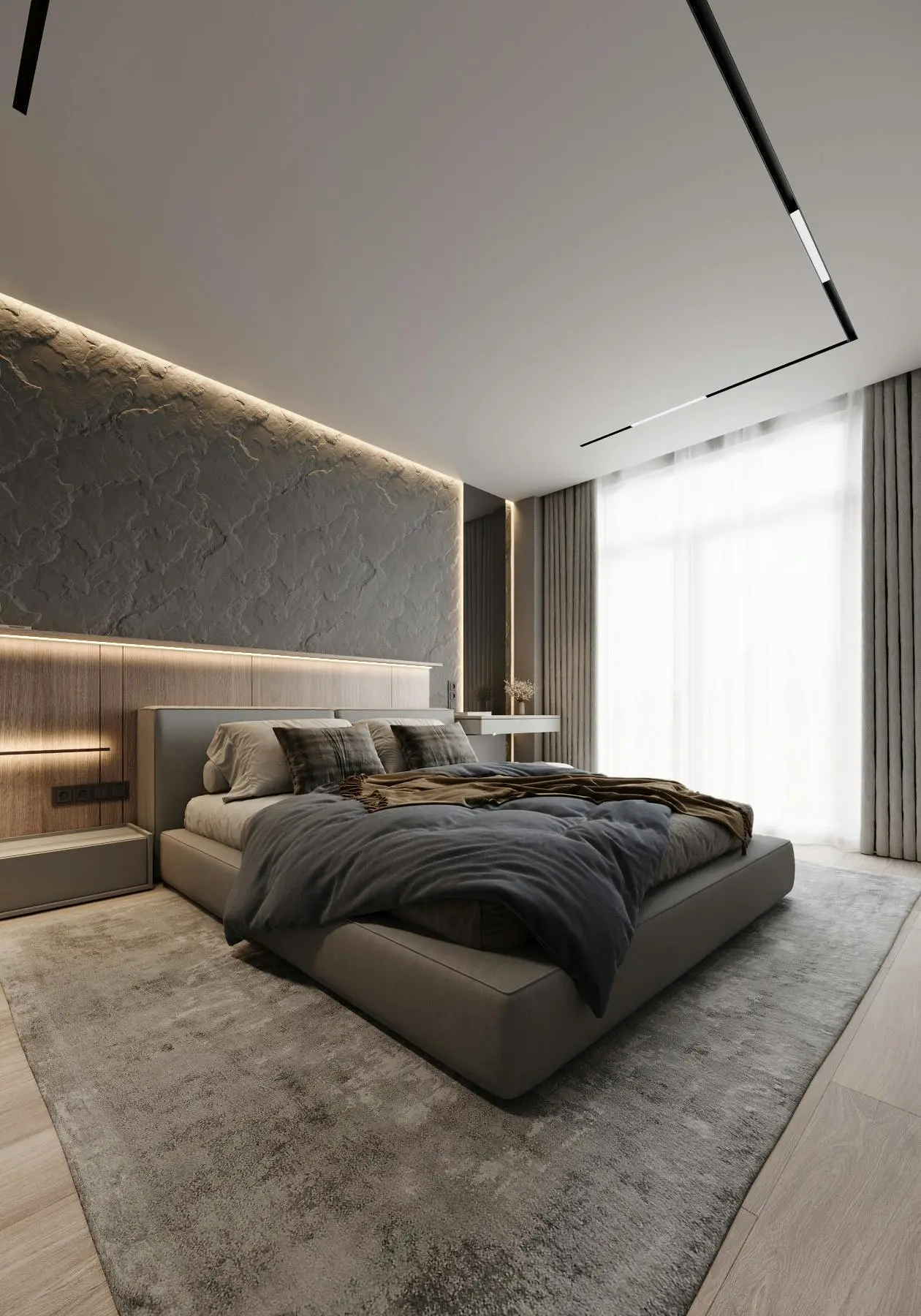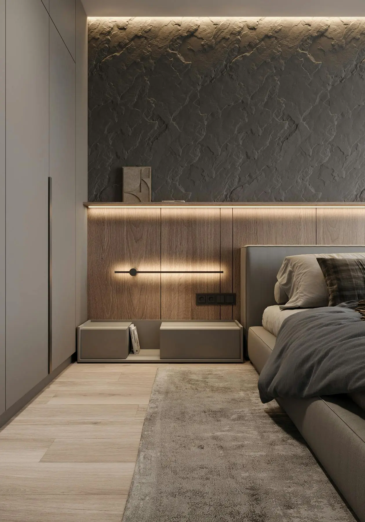 Дизайн-проєкт функціональної та мінімалістичної квартири у стилі джапанді. Цей стиль поєднує в собі скандинавську функціональність та японську мінімалістичну естетику. Йому притаманні світлі, природні кольори та використання натуральних матеріалів. Тому, в цьому проєкті ми спостерігаємо імітацію скель на стінах, використання меблів з дерева, а ще багато зелені. Передпокій виконано в сірому кольорі. Ми бачимо стіну, що імітує скелю. До стіни на всю висоту прикріплено велике дзеркало з вертикальною підсвіткою, яка додає об'єму нашій фактурній стіні. Частину дзеркала посередині перекриває підвісний міні-столик в шухлядах якого зручно зберігати ключі та інші дрібниці. Різноманітні двері прихованого монтажу ведуть в наступні кімнати. Спальня також має акцентну стіну позаду ліжка - частково імітація темної скелі частково обшита панелями з дерева. Стеля та стик двох різних фактур підсвічуються. Ліворуч від входу в кімнату розташували сіру шафу одна з секцій якої є відкритою для зберігання книг та декору. З одного боку ліжка стоїть сіра тумба та горизонтальне бра, з іншого - коносльний столик та високе дзеркало з вертикальними підсвітками. Саме ліжко досить велике та має широкі м'які бортики. Загалом атмосфера у спальні досить камерна та затишна. В кабінеті немає нічого зайвого, а кольорова гама досить стримана. Практично всі елементи: диван, шафа, стіл, стіни, килим та торшер світло-сірого кольору. Для когось такий простір може видатися нудним, а комусь допоможе сконцентруватися на основному. Санвузол - найтемніше приміщення у цій квартирі адже тут використали темно-сірий керамограніт з імітацією мармуру. Ним також обшили раковину та ванну. На десерт залишили кухню - вітальню. В цьому приміщенні досить світло через велике вікно. Тут також переважає сірий колір. Кухонні фасади, декоративна обшивка стіни за телевізором, тумба під телевізором, диван і навіть килим - все світло - сірого кольору. Кухня досить довга і має незвичний елемент стіну з відкритими полицями посередині. Диван в центрі кімнати модульний. В стіну поруч з вікном вбудували етажерку для книг. Праворуч біля дивану є круглий стіл з красивою люстрою над ним.