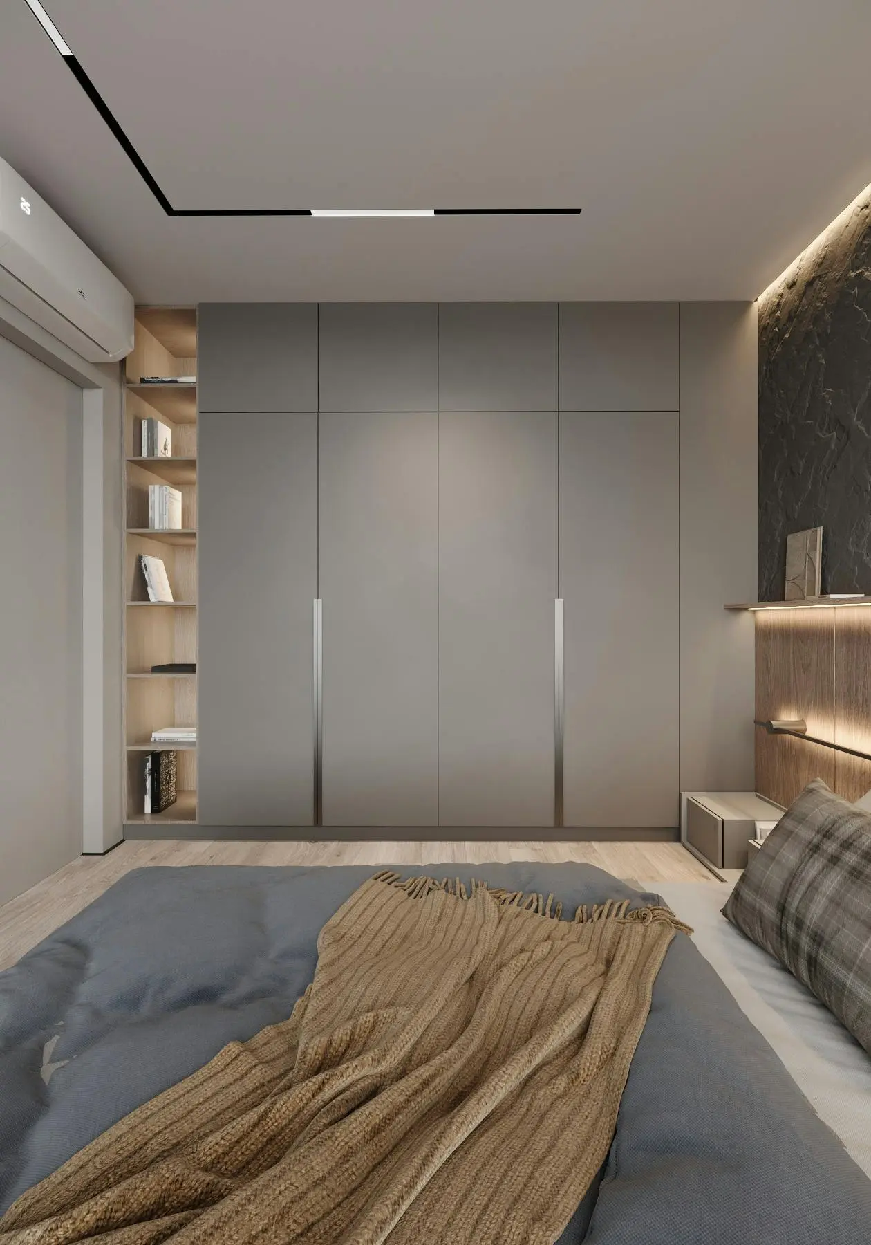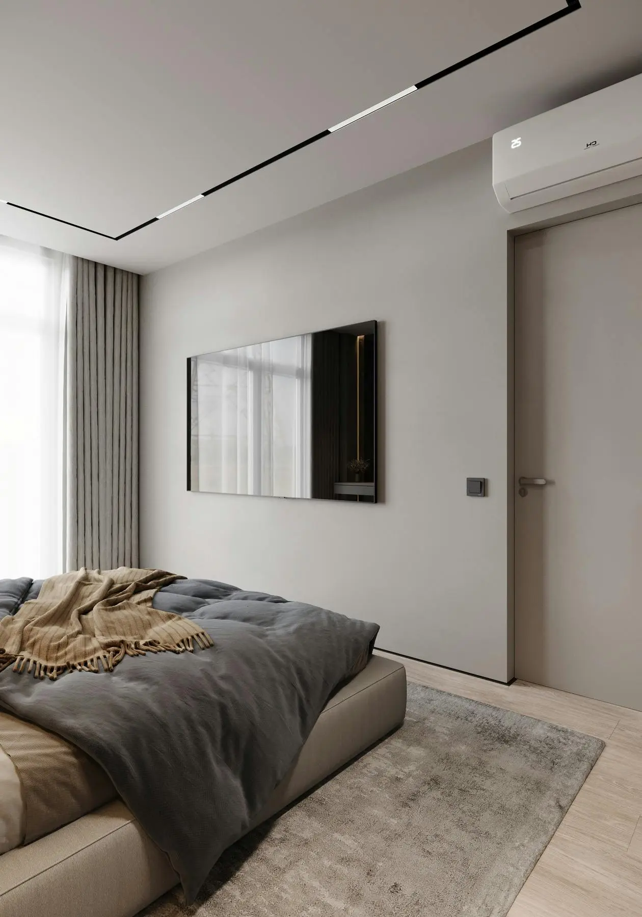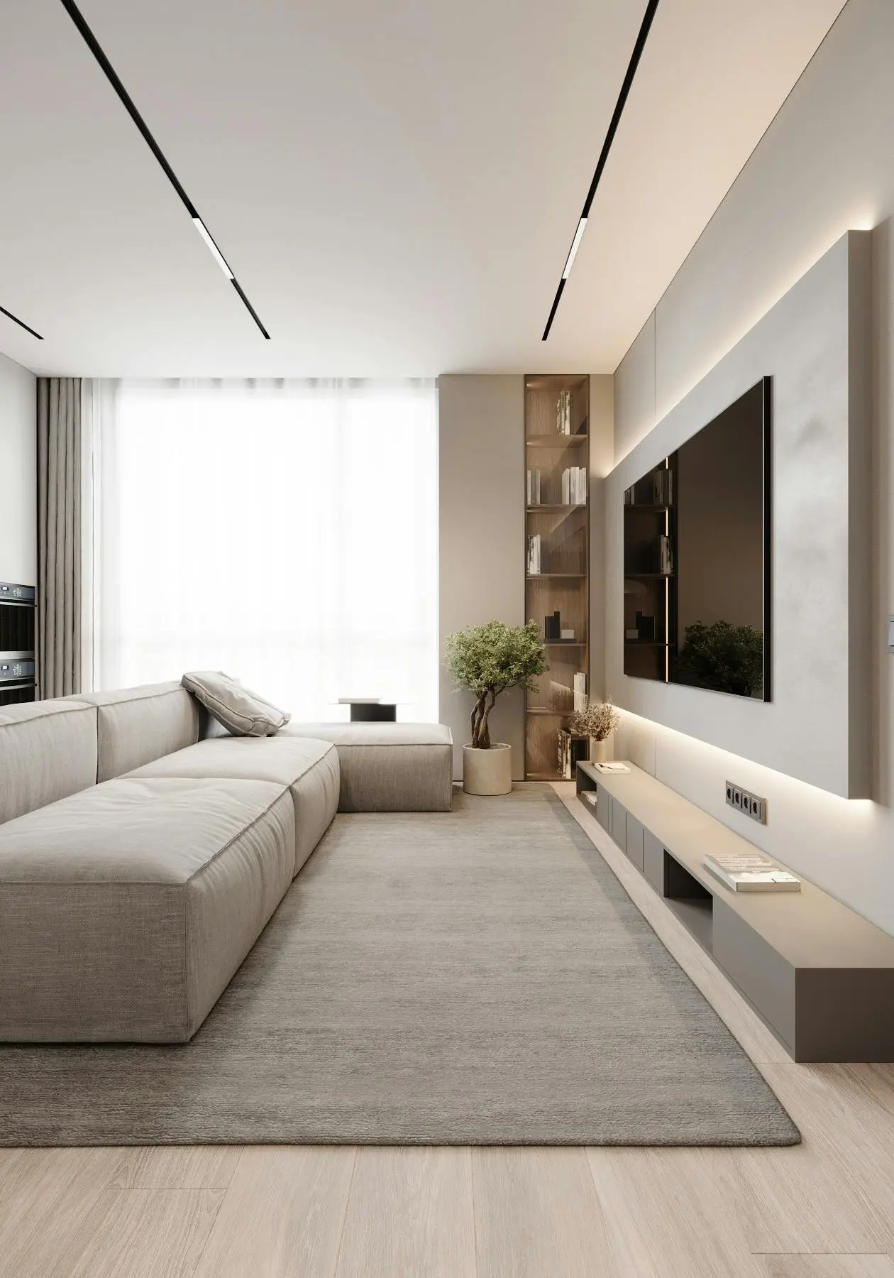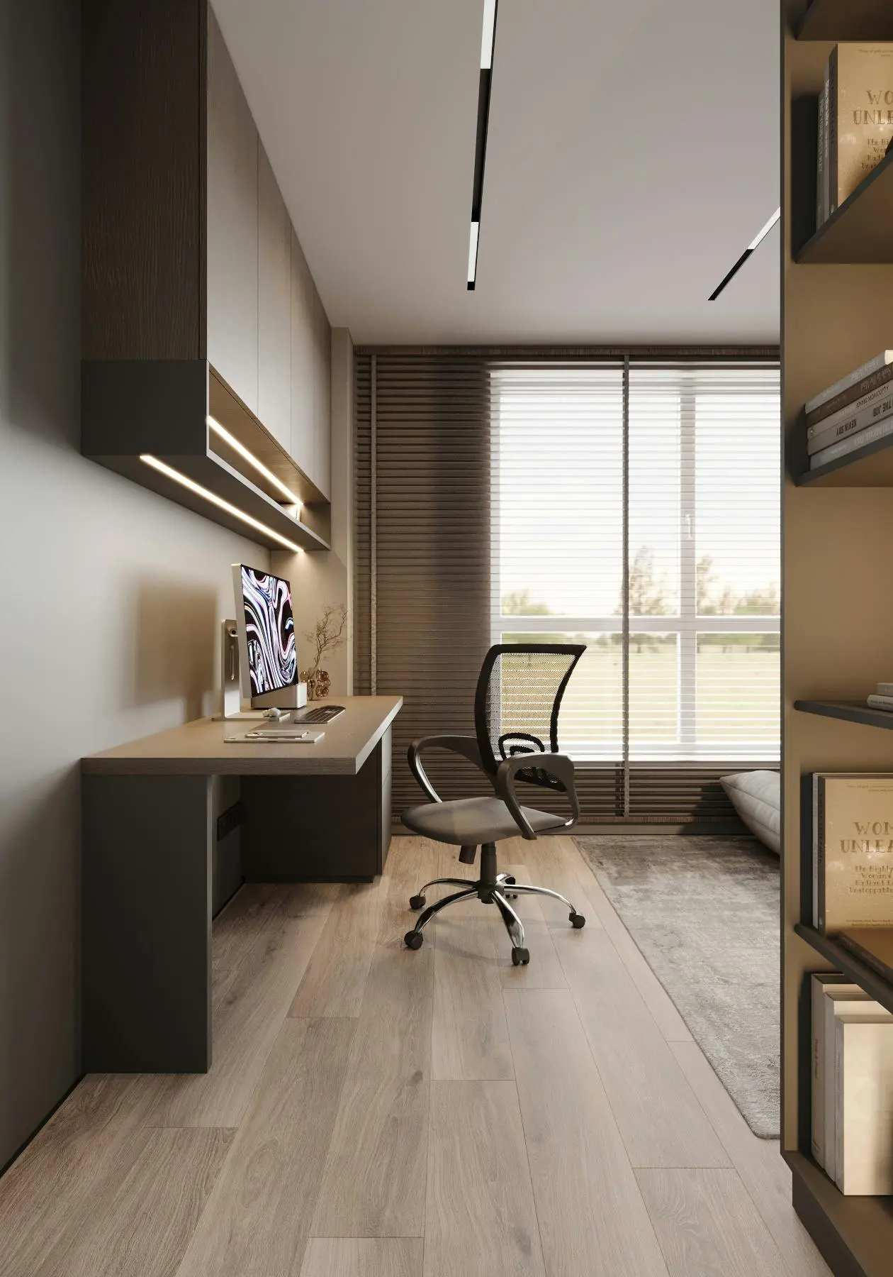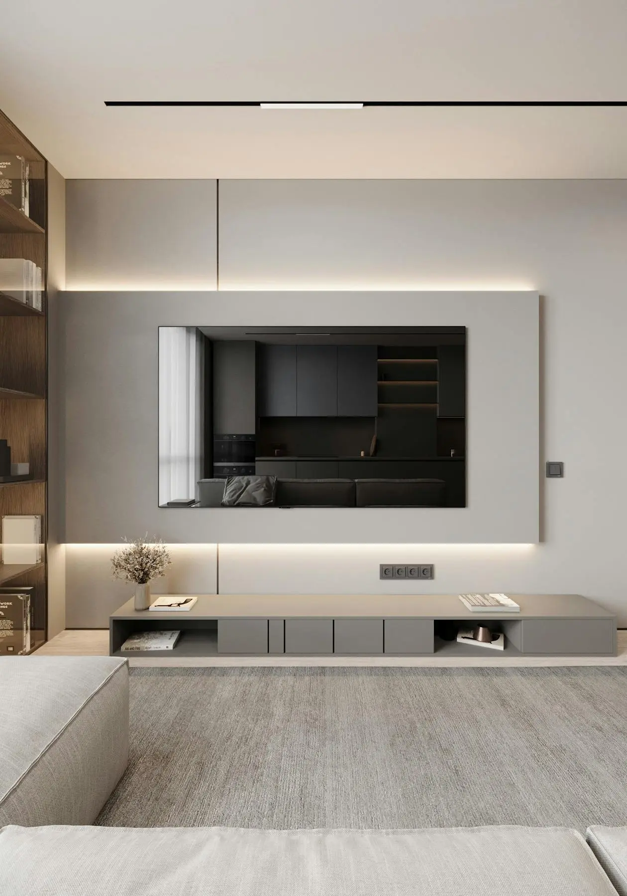 Дизайн-проєкт функціональної та мінімалістичної квартири у стилі джапанді. Цей стиль поєднує в собі скандинавську функціональність та японську мінімалістичну естетику. Йому притаманні світлі, природні кольори та використання натуральних матеріалів. Тому, в цьому проєкті ми спостерігаємо імітацію скель на стінах, використання меблів з дерева, а ще багато зелені. Передпокій виконано в сірому кольорі. Ми бачимо стіну, що імітує скелю. До стіни на всю висоту прикріплено велике дзеркало з вертикальною підсвіткою, яка додає об'єму нашій фактурній стіні. Частину дзеркала посередині перекриває підвісний міні-столик в шухлядах якого зручно зберігати ключі та інші дрібниці. Різноманітні двері прихованого монтажу ведуть в наступні кімнати. Спальня також має акцентну стіну позаду ліжка - частково імітація темної скелі частково обшита панелями з дерева. Стеля та стик двох різних фактур підсвічуються. Ліворуч від входу в кімнату розташували сіру шафу одна з секцій якої є відкритою для зберігання книг та декору. З одного боку ліжка стоїть сіра тумба та горизонтальне бра, з іншого - коносльний столик та високе дзеркало з вертикальними підсвітками. Саме ліжко досить велике та має широкі м'які бортики. Загалом атмосфера у спальні досить камерна та затишна. В кабінеті немає нічого зайвого, а кольорова гама досить стримана. Практично всі елементи: диван, шафа, стіл, стіни, килим та торшер світло-сірого кольору. Для когось такий простір може видатися нудним, а комусь допоможе сконцентруватися на основному. Санвузол - найтемніше приміщення у цій квартирі адже тут використали темно-сірий керамограніт з імітацією мармуру. Ним також обшили раковину та ванну. На десерт залишили кухню - вітальню. В цьому приміщенні досить світло через велике вікно. Тут також переважає сірий колір. Кухонні фасади, декоративна обшивка стіни за телевізором, тумба під телевізором, диван і навіть килим - все світло - сірого кольору. Кухня досить довга і має незвичний елемент стіну з відкритими полицями посередині. Диван в центрі кімнати модульний. В стіну поруч з вікном вбудували етажерку для книг. Праворуч біля дивану є круглий стіл з красивою люстрою над ним.