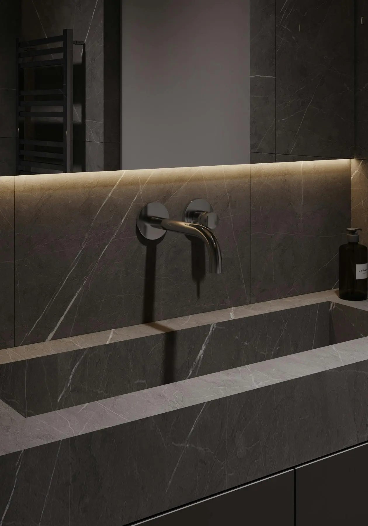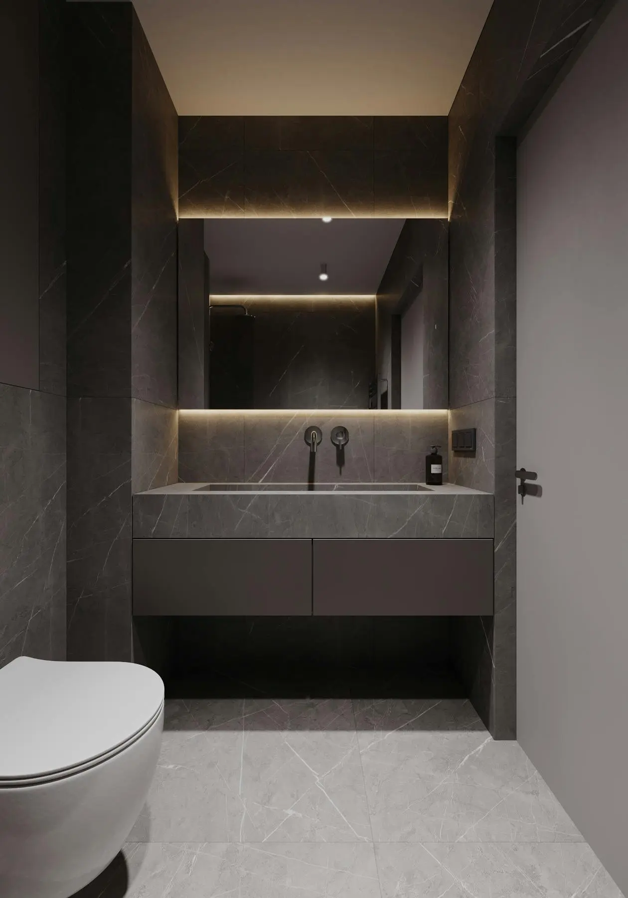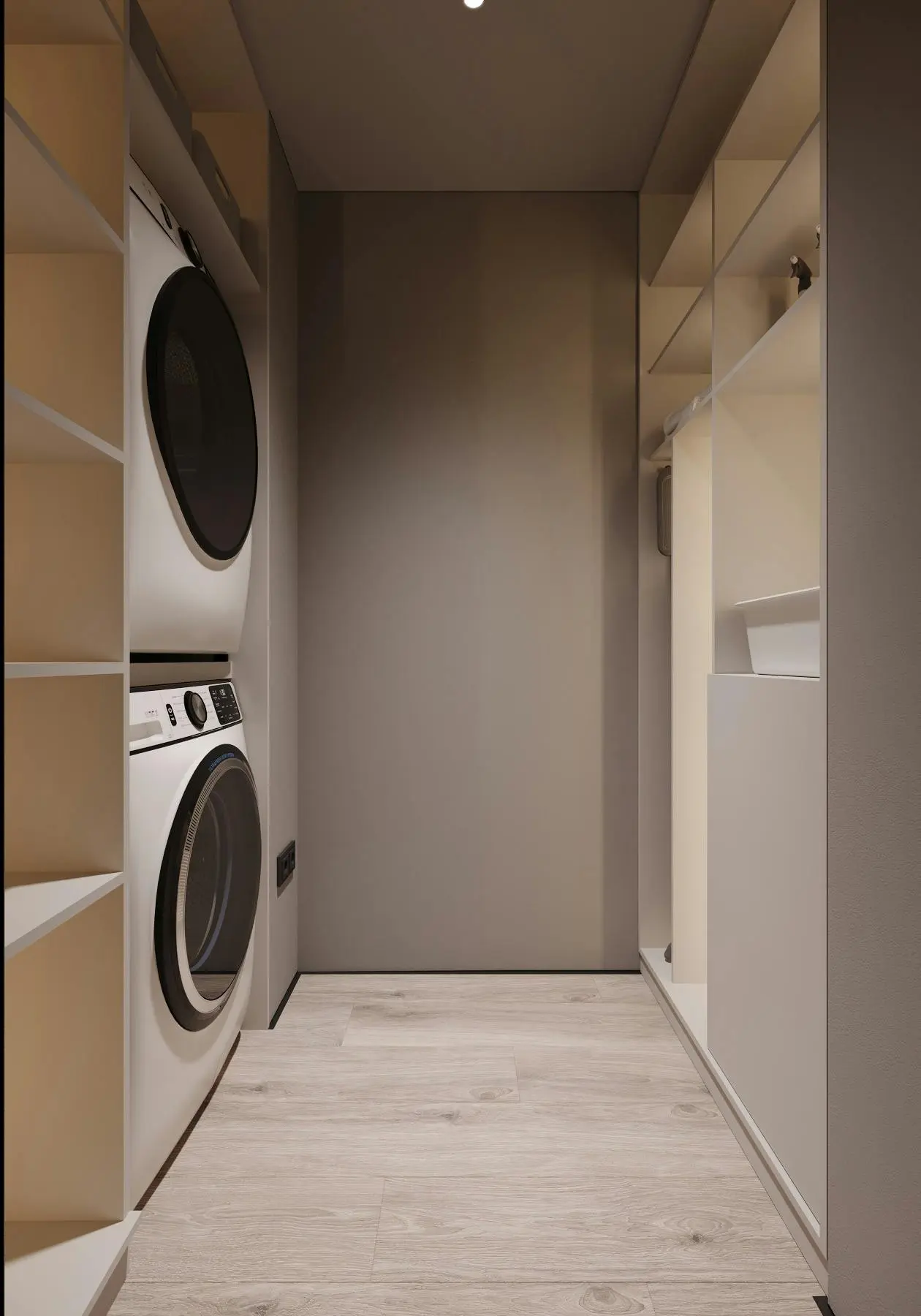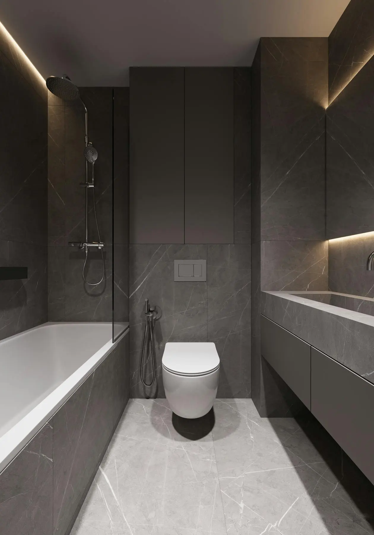 Дизайн-проєкт функціональної та мінімалістичної квартири у стилі джапанді. Цей стиль поєднує в собі скандинавську функціональність та японську мінімалістичну естетику. Йому притаманні світлі, природні кольори та використання натуральних матеріалів. Тому, в цьому проєкті ми спостерігаємо імітацію скель на стінах, використання меблів з дерева, а ще багато зелені. Передпокій виконано в сірому кольорі. Ми бачимо стіну, що імітує скелю. До стіни на всю висоту прикріплено велике дзеркало з вертикальною підсвіткою, яка додає об'єму нашій фактурній стіні. Частину дзеркала посередині перекриває підвісний міні-столик в шухлядах якого зручно зберігати ключі та інші дрібниці. Різноманітні двері прихованого монтажу ведуть в наступні кімнати. Спальня також має акцентну стіну позаду ліжка - частково імітація темної скелі частково обшита панелями з дерева. Стеля та стик двох різних фактур підсвічуються. Ліворуч від входу в кімнату розташували сіру шафу одна з секцій якої є відкритою для зберігання книг та декору. З одного боку ліжка стоїть сіра тумба та горизонтальне бра, з іншого - коносльний столик та високе дзеркало з вертикальними підсвітками. Саме ліжко досить велике та має широкі м'які бортики. Загалом атмосфера у спальні досить камерна та затишна. В кабінеті немає нічого зайвого, а кольорова гама досить стримана. Практично всі елементи: диван, шафа, стіл, стіни, килим та торшер світло-сірого кольору. Для когось такий простір може видатися нудним, а комусь допоможе сконцентруватися на основному. Санвузол - найтемніше приміщення у цій квартирі адже тут використали темно-сірий керамограніт з імітацією мармуру. Ним також обшили раковину та ванну. На десерт залишили кухню - вітальню. В цьому приміщенні досить світло через велике вікно. Тут також переважає сірий колір. Кухонні фасади, декоративна обшивка стіни за телевізором, тумба під телевізором, диван і навіть килим - все світло - сірого кольору. Кухня досить довга і має незвичний елемент стіну з відкритими полицями посередині. Диван в центрі кімнати модульний. В стіну поруч з вікном вбудували етажерку для книг. Праворуч біля дивану є круглий стіл з красивою люстрою над ним.